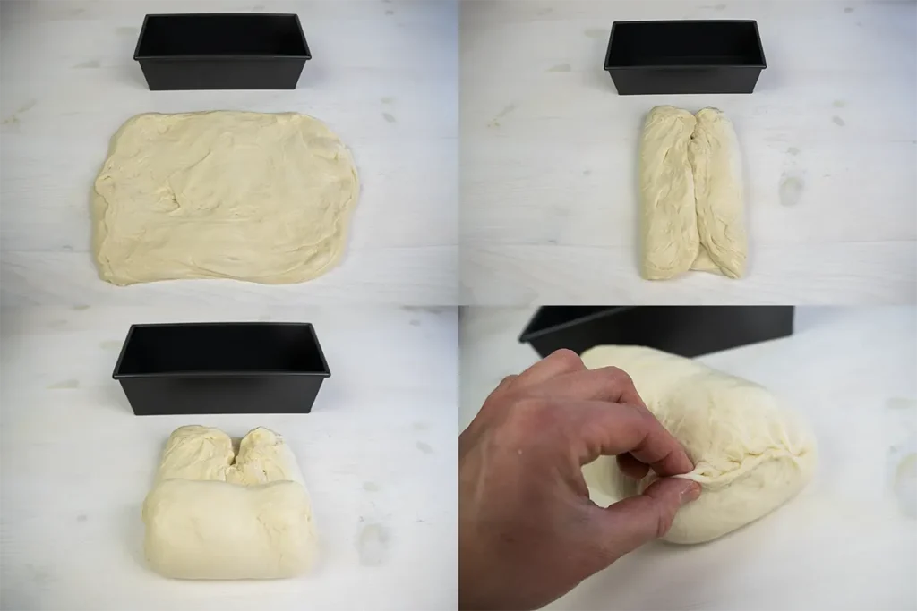 Gently remove the dough from the bowl onto a lightly-floured surface, with the nice smooth side of the dough on the bottom. Stretch it out into a rectangle slightly wider than your loaf pan. Fold the sides into the middle, roll it up, and pinch the seams shut. Roll the log a few times to gently stretch it out to the width of the loaf pan. By the way, I used this 1.5-pound loaf pan, if yours is much larger or smaller you may want to scale the recipe up or down.